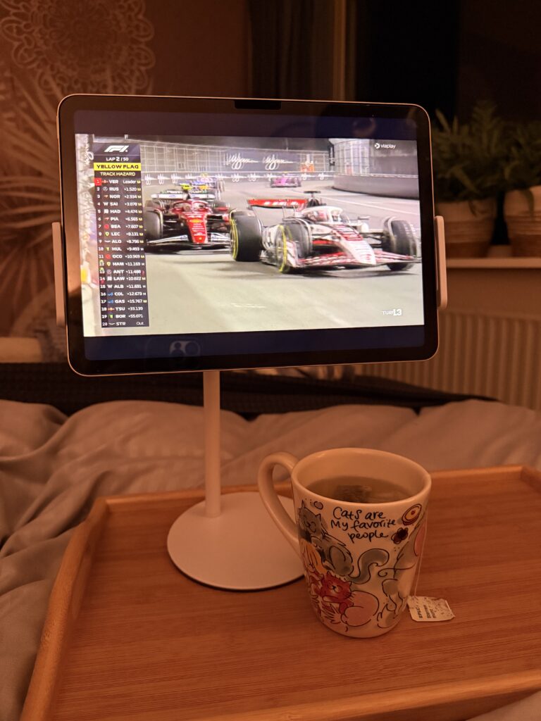 Het is zoveel fijner om mijn dag te starten voor mezelf, in alle rust zoals vanochtend op bed met de F1 op m’n iPad en een kopje thee on te side. Och, wat is dat een rijkdom, zeg? Sowieso: iedere ochtend wordt ik wakker om de zon te zien opkomen. Mits het niet bewolkt is, hè, haha.